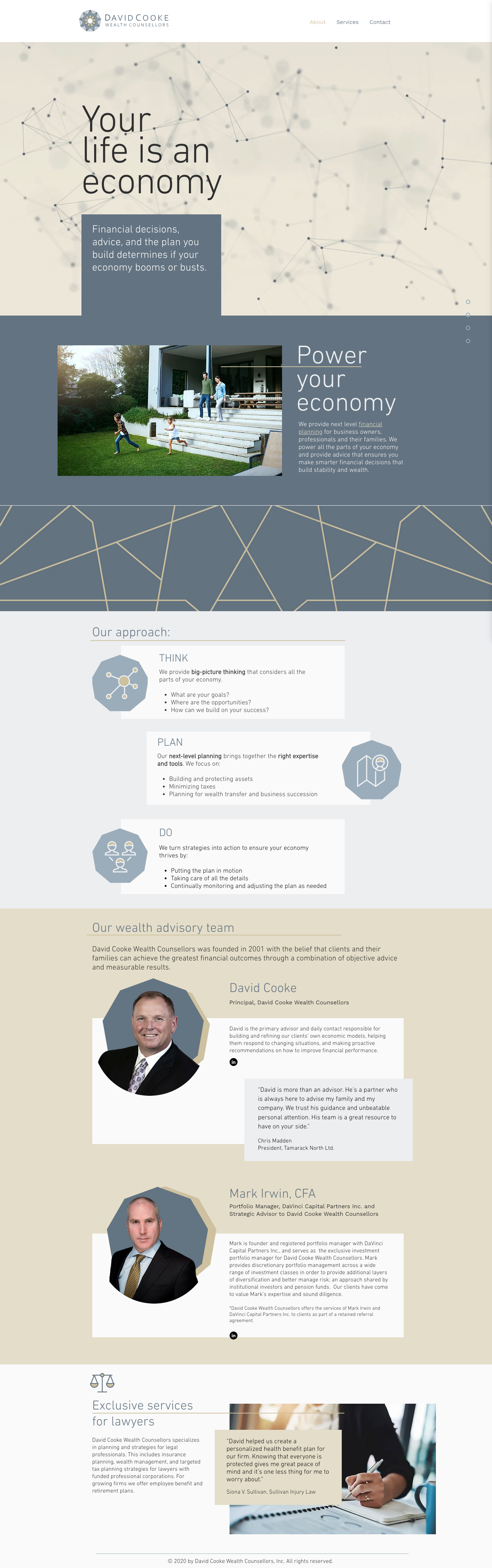 David Cooke is an independent wealth advisor that believes in a holistic view of the client to grow wealth and protect it. The key to this planning involves a simple yet comprehensive macro-economic model that provides clients the opportunity to see their financial situation on one page. The identity was inspired by this model, and the nine-sided polygon reflects nine areas of exploration that yield a complete picture of the client’s situation. The open linework is connected to form arrows and ingots, that are focused on the client.